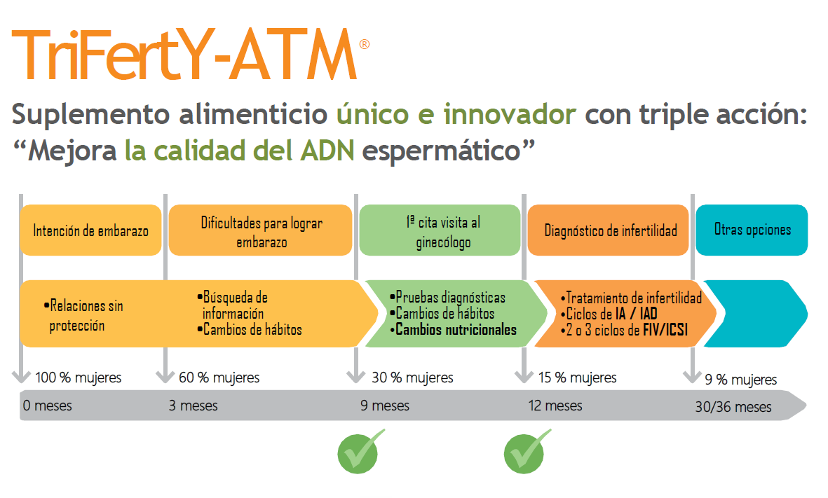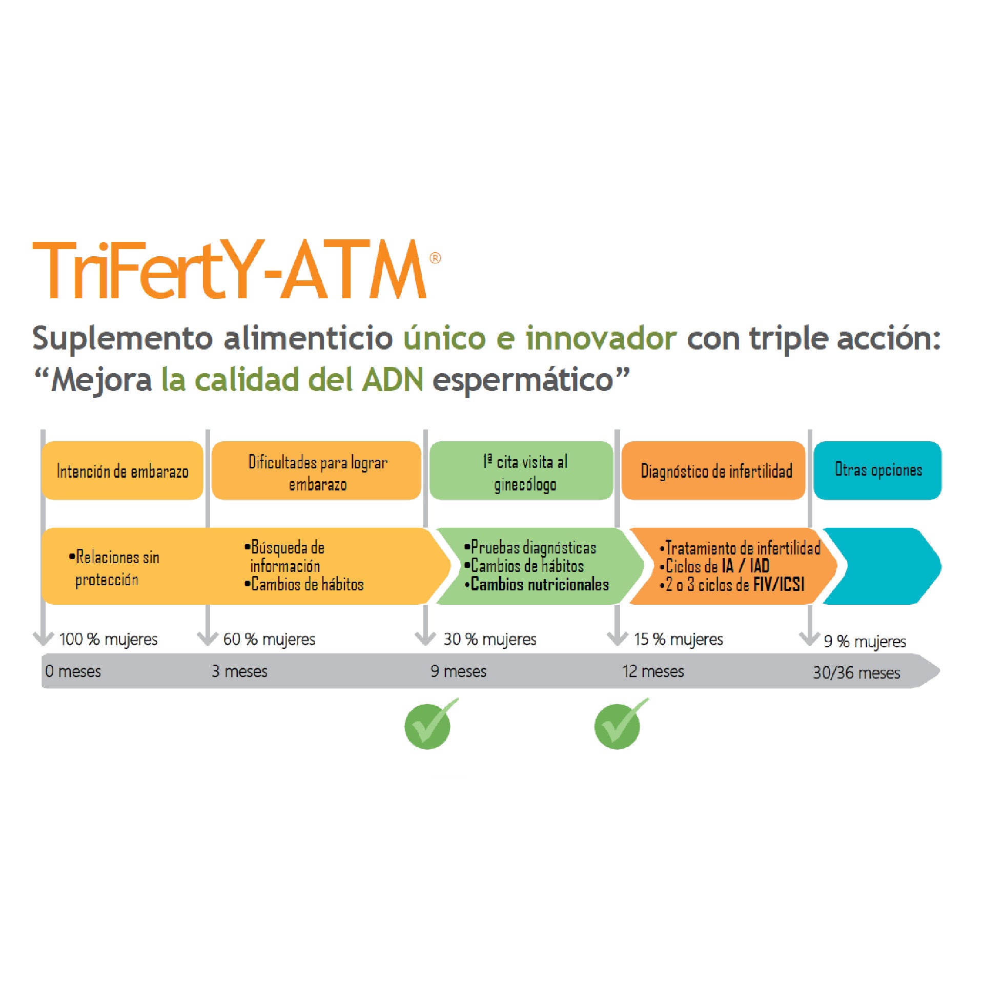 Para él: TriFertY-ATM es nuevo complemento alimenticio oral basado en cúrcuma, ginkgo biloba e inositol, que reduce la tasa de fragmentación del ADN espermático y aumenta la tasa de parto en pacientes con fracasos previos de FIV/ICSI*.  Además, ayuda a mejorar la tasa de embarazo de forma natural y a llegar a los tratamientos de reproducción asistida en las mejores condiciones.
