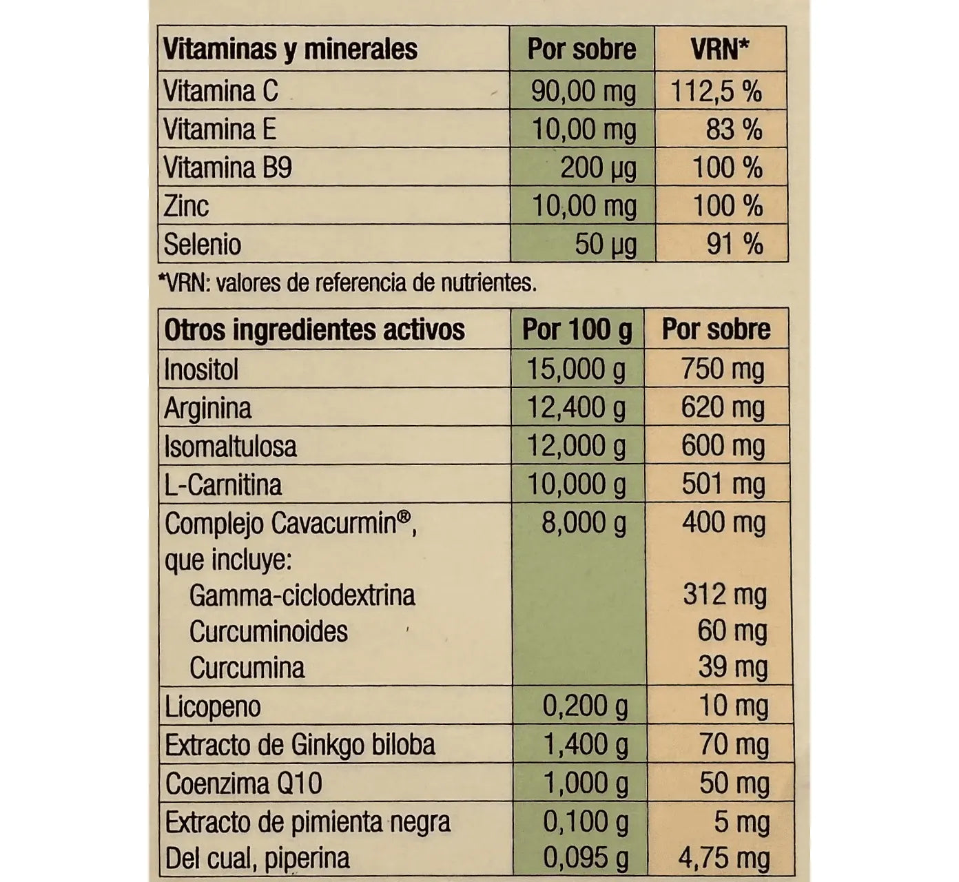 Fumarato de L-carnitina, clorhidrato de arginina, inositol, Palatinose® (isomaltulosa), complejo Cavacurmin® (gamma-ciclodextrina, curcumina aportada por un extracto de cúrcuma [Curcuma longa L.]), agente de carga (manitol), aroma a limón, antiaglomerante (dióxido de silicio), aroma a naranja, L-ascorbato de calcio (vitamina C), licopeno prescrito al 10 %, extracto de ginkgo (Ginkgo biloba L.), acidulantes (ácido cítrico anhidro, ácido málico), coenzima Q10, sulfato de zinc, acetato de DL-tocoferol (vitamina E), edulcorantes (sucralosa, sacarina sódica, acesulfamo de potasio, neohesperidina DC, neotamo), aroma, extracto de pimienta negra (Piper nigrum L.), ácido fólico (vitamina B9) y selenito de sodio.